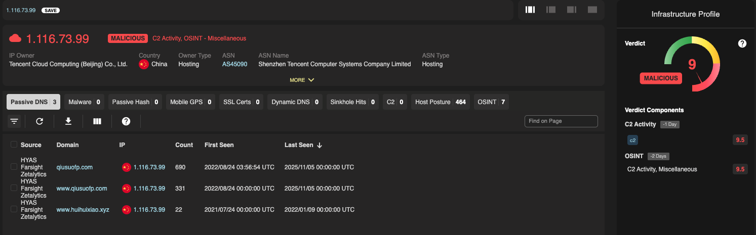 A new Source Masking section has been added to IP infrastructure profiles in HYAS Insight, helping you quickly determine if an IP is linked to obfuscation services like VPNs or proxies. The section appears only when relevant indicators are present in IPInfo data and provides clear, human-readable tags and context.