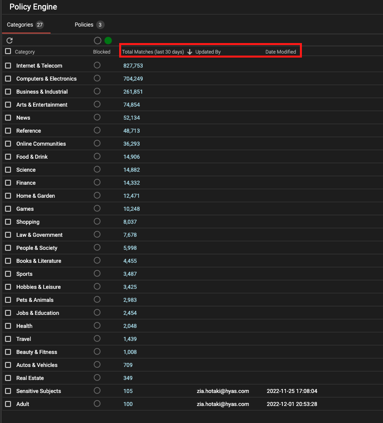 Any of the five (5) columns may be sorted on: Category, Blocked, Total Matches (last 30 days), Updated By, and Date Modified