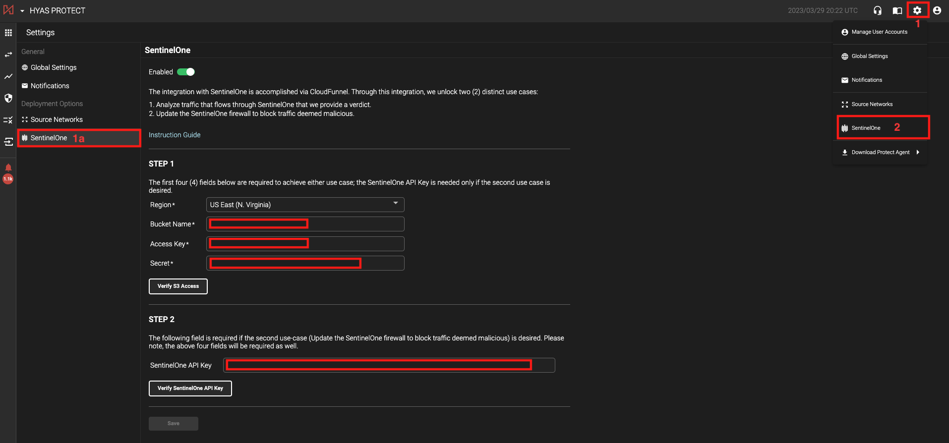 The configuration for the SentinelOne Deployment option is available through the gear icon at the top-right (1), followed by clicking on the SentinelOne drop-down (2), or, if you happen to already be in the new dedicated settings page, moving over to the location available (1a). Both paths will take you to the same destination:
