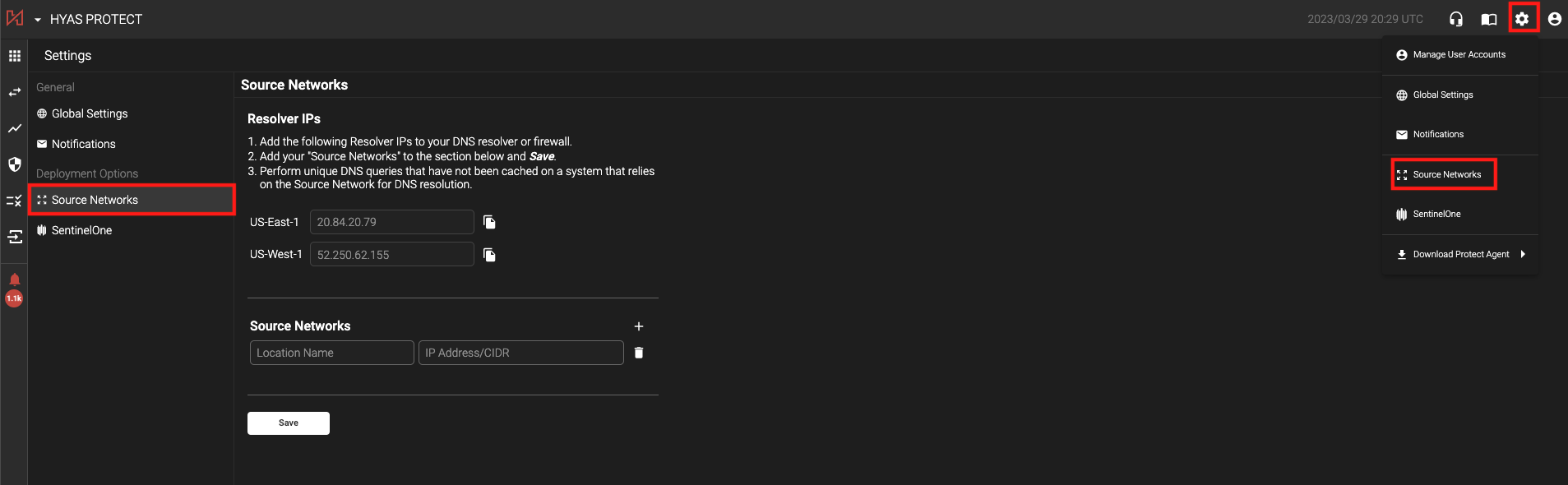 Like SentinelOne, the configuration for the Source Networks is available through the gear icon at the top-right, followed by clicking on the Source Networks drop-down, or, if you happen to already be in the new dedicated settings page, moving over to the location available. Both paths will take you to the same destination: