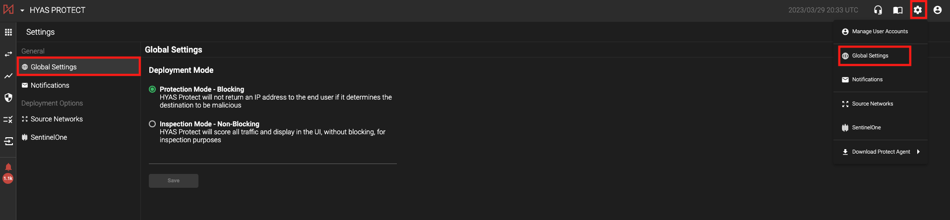 Like SentinelOne and Source Networks, the configuration for the Deployment Mode is available through the gear icon at the top-right, followed by clicking on the Global Settings drop-down, or, if you happen to already be in the new dedicated settings page, moving over to the location available. Both paths will take you to the same destination: