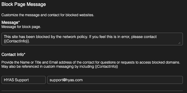 HYAS includes default messaging for the block page. To customize this message, enter new text in the Message field.