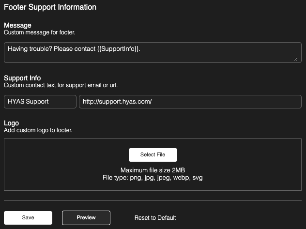 If you wish to customize the Footer, you may do so by configuring the footer Message and Support Info sections as well as upload your own custom Logo to be displayed on the block page.