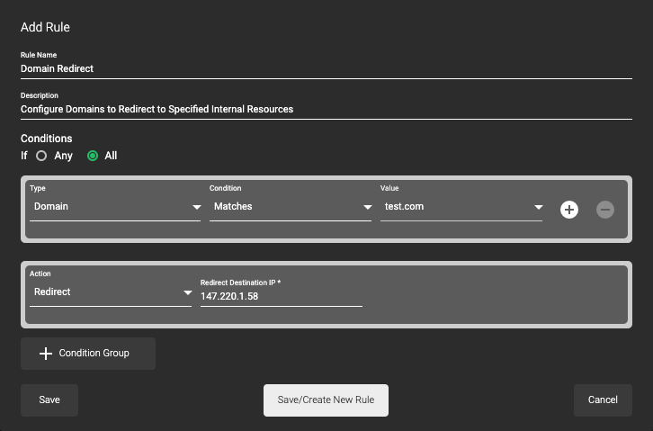 This feature introduces the ability to redirect queries for specific domains or FQDNs to designated internal IP addresses. Administrators can easily configure routing rules using a new “Redirect” action and destination IP field, ensuring smooth network management across all deployment types. When employees are on-site and access the main company website, they can be seamlessly redirected to internal resources, improving access efficiency and reducing external traffic.
