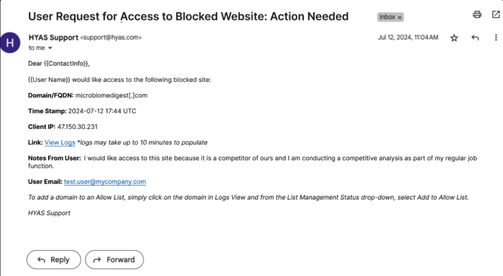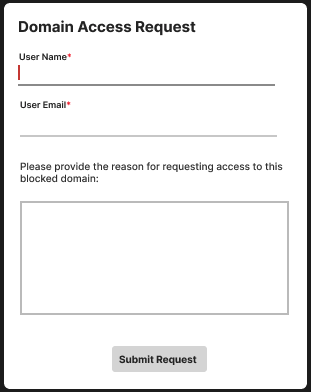 Users who encounter a blocked website can now request access directly from the Block Page. When enabled by an administrator, the Request Access button appears on the Block Page, allowing users to submit a request with their name, email, and reason for access. Administrators receive a structured email with key details, including a timestamp, client IP, block reason, and a link to relevant logs, making it easier to review and respond to requests.