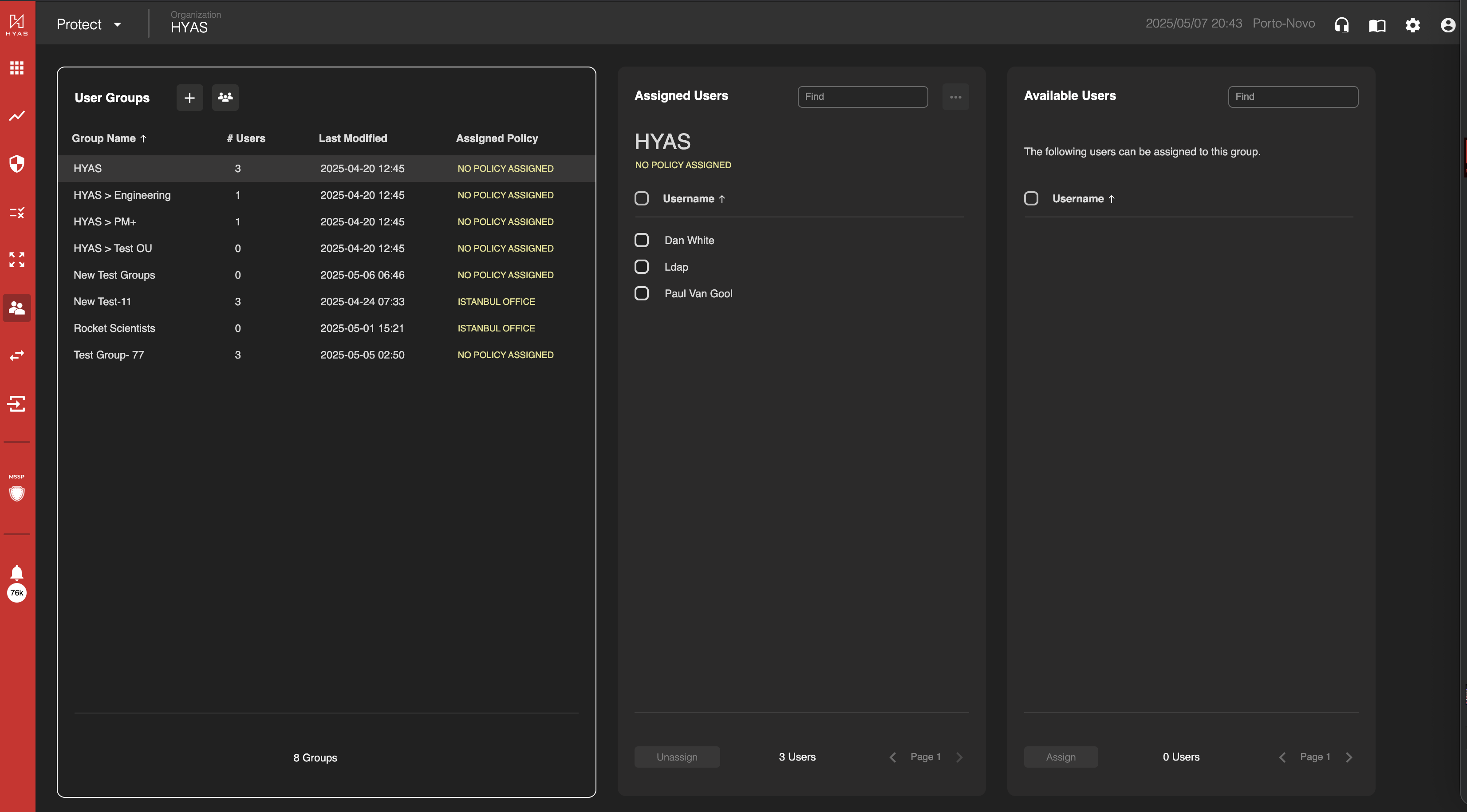 User Groups are now available in HYAS Protect, representing a major leap forward in policy management flexibility. Admins can now group users by agent-reported usernames and assign policies tailored to each group—enabling precise, role-aligned protection that mirrors how teams and departments are structured in the real world.