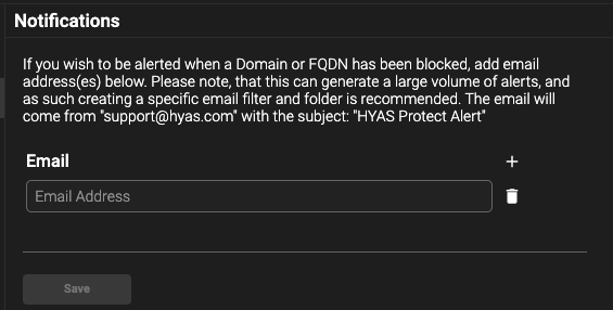 Please note that configuring email alerts for blocked domains or FQDN’s may cause a large volume of emails. Creating an email filter and folder to manage these may be necessary. The email will come from "support@hyas.com" with the subject: "HYAS Protect Alert"