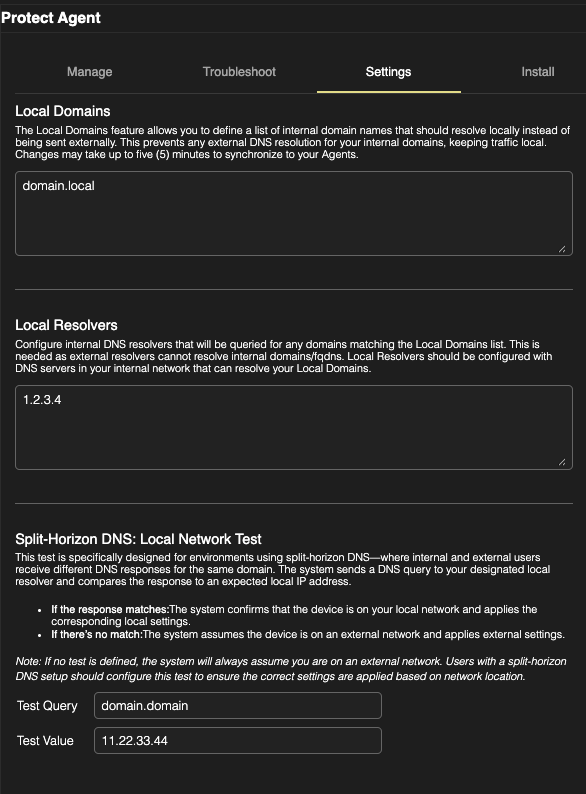 Finally, enter your Local Domains in the first box. Configuring Local Domains will let the HYAS Protect Agent know when it should resolve domains locally instead of sending them for external resolution.