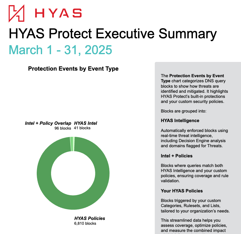 The HYAS Protect Executive Summary, generated monthly, delivers clear, actionable insights on critical security metrics, helping decision-makers focus on areas like riskiest users, blocked domains, and DNS activity. By highlighting key trends and vulnerabilities, it empowers organizations to enhance their security posture effectively. The intuitive format ensures security leaders have the information they need to make informed decisions.