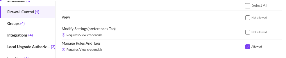 Custom Role Requirements: Firewall -> Manage Rules and Tags=Allowed
