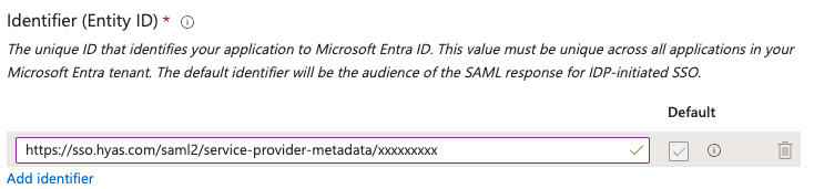 Copy the Audience URL in HYAS Protect and paste it in the Identifier (Entity ID) cell in Entra.