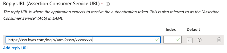 Copy the SSO URL from HYAS Protect and paste it in the Reply URL (Assertion Consumer Service URL) in Entra.