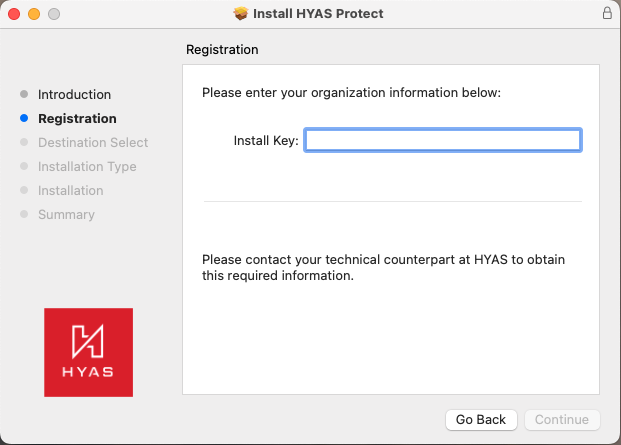 2.5.1 To obtain your Install Key, navigate to the HYAS Protect UI>Settings>Organization Settings> Protect Agent> Install. Copy your Install Key and paste it here.